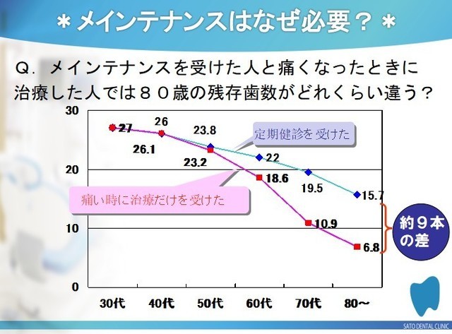 当院は、「再発しない治療」を目指しており、むし歯・歯周病の定期予防型歯科医院です。一度治療した歯、失った歯は元には戻りません。なので、治療後のメインテナンスが治療以上に大切です。治療前後の口腔内写真の資料をもとにお話させていただきます。