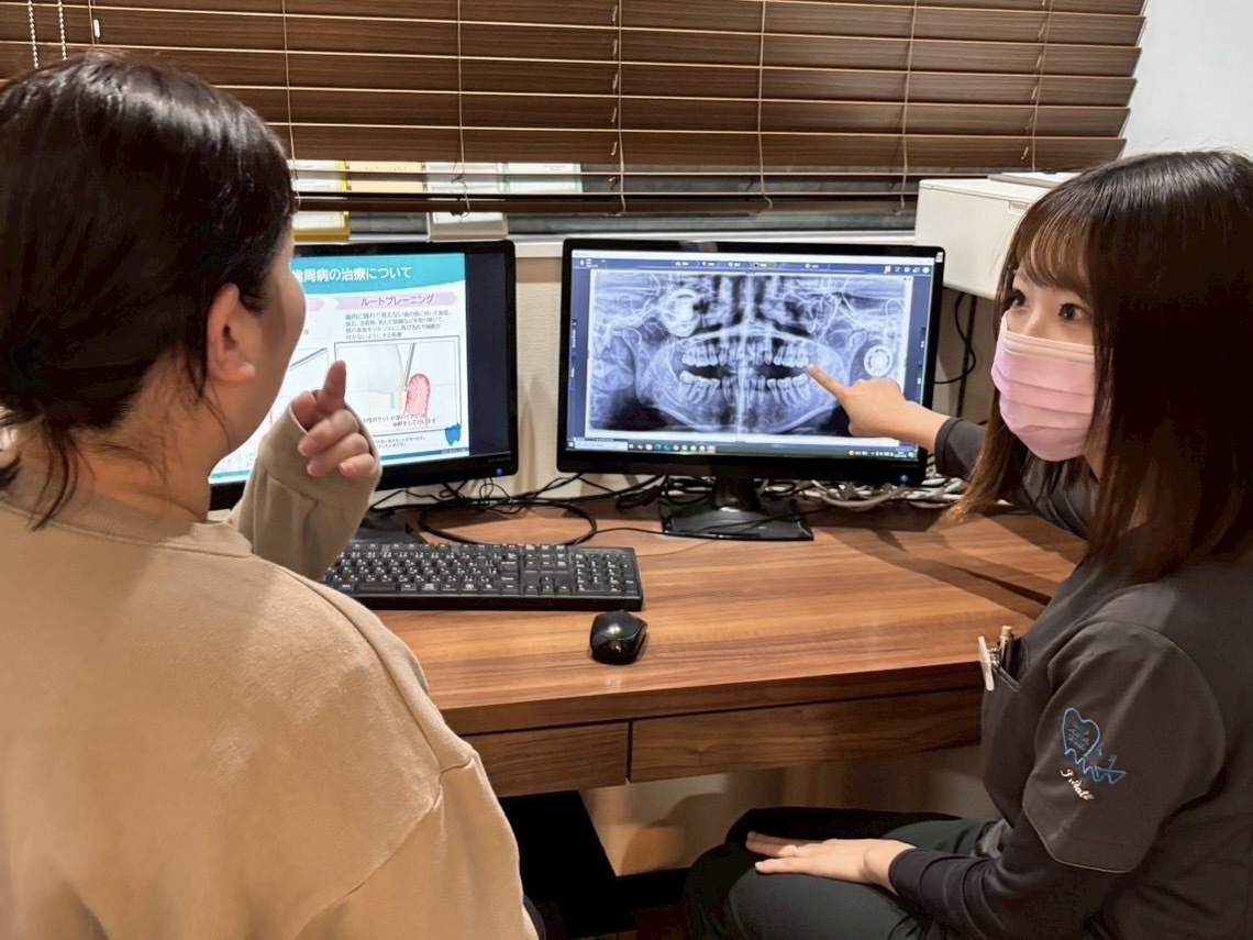 現在のお口の状態について詳しく説明させていただきます。一生涯、ご自身の歯で美味しくお食事をして頂く為に、まずは、ご自身の歯の状態をよく知っていただきます。治療前に、お口の中の写真を撮影した資料をもとに、虫歯や歯周病の状態・治療計画、セルフケアの必要性についてしっかりと説明させていただきます。