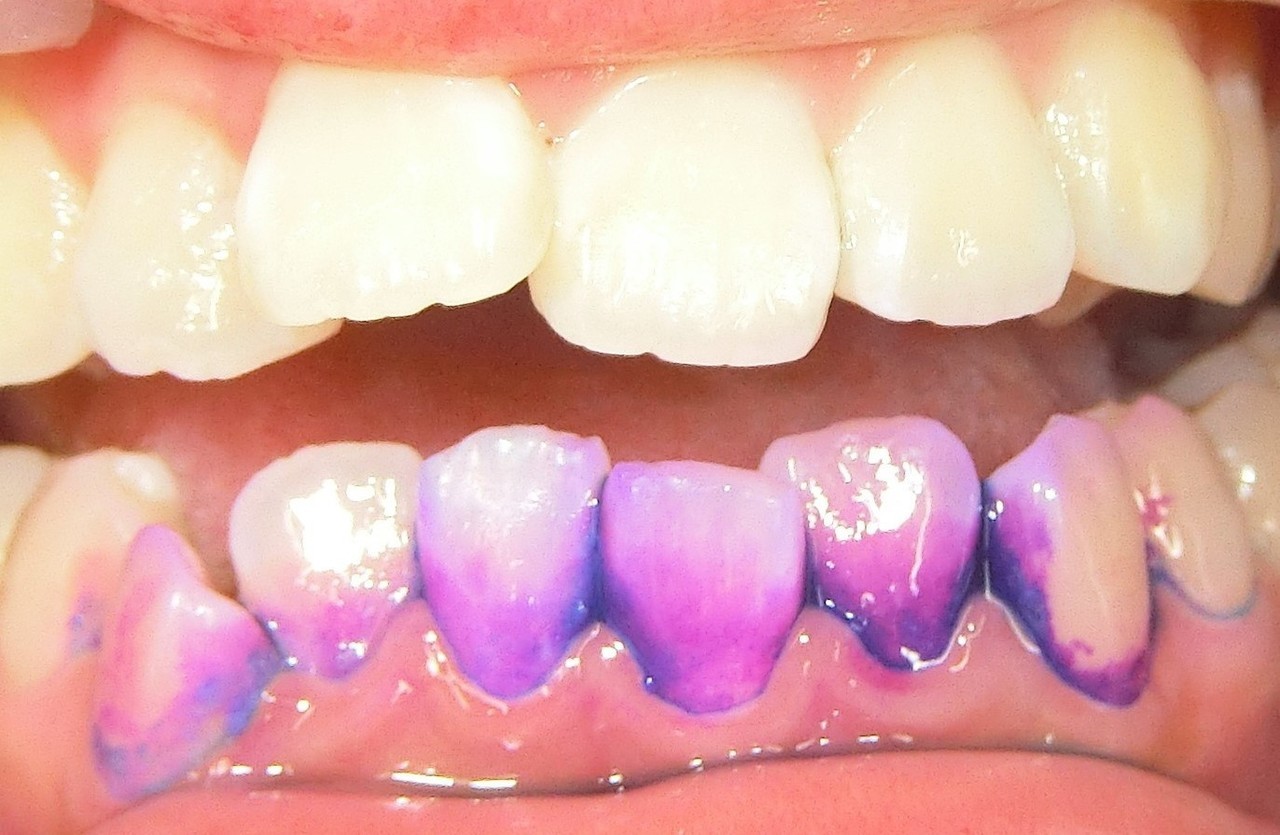 部分的に歯の歯垢(プラーク)を青や紫色に染めて、磨き残しを可視化し、磨き残しの部位を確認して頂きます。セルフケアの指導の参考にします。