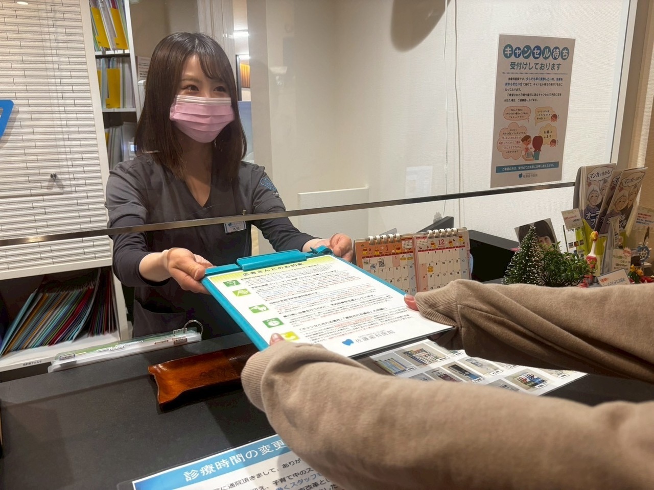 まずは受付にて、保険証・診察券(再診の場合のみ)をご提示ください。その際に予診表をお渡ししますので、ご記入をお願いいたします。