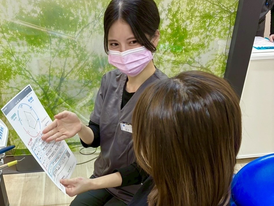 治療前後の写真の資料で治療部位の説明、定期健診の必要性に関して、データをもとにしっかり説明させて頂きます。メインテナンスの期間は、歯周病学会が推奨している3カ月が基本になりますが、お口の状態によって担当医・担当歯科衛生士が判断したうえで、ご相談させて頂きます。