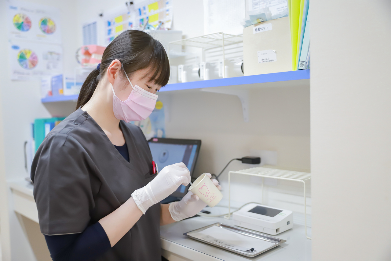 歯科衛生士が唾液検査を行います。専用の洗口液を10秒間全体にいき渡るように洗口していただきます。
